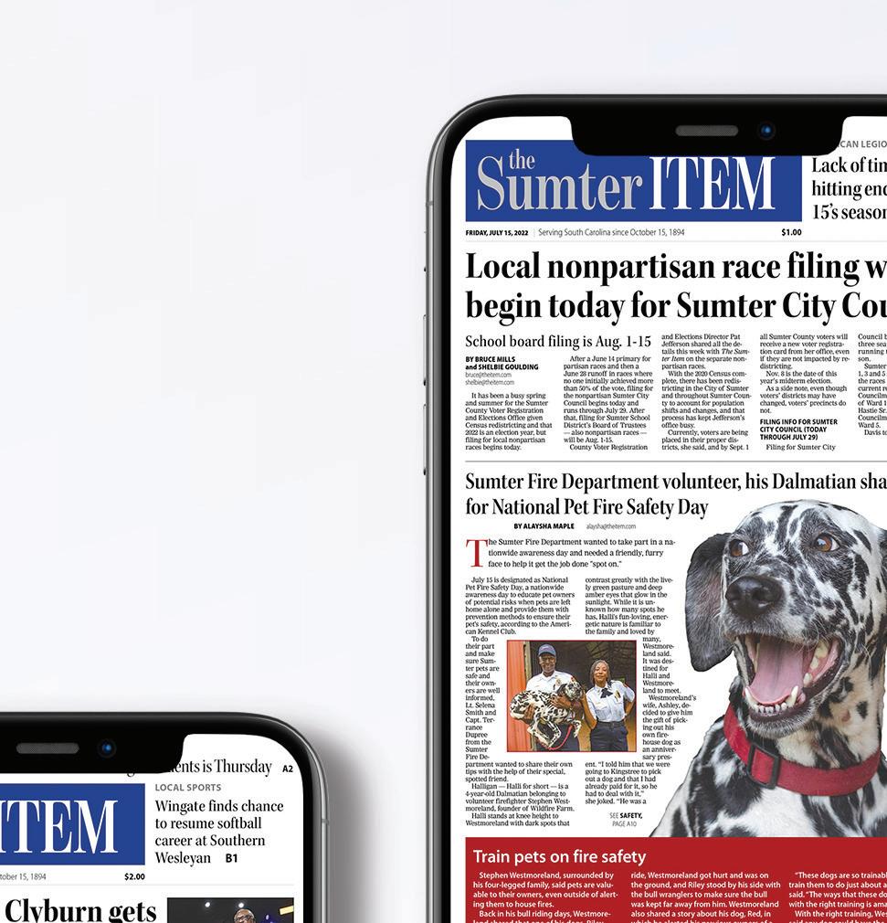 reach AUDIENCE www.theitem.com your Newspaper Print & Digital • Newspaper delivered Wednesday & Weekends • Weekend money-saving coupons** • Unlimited Access to eItem.com • Unlimited Access to our daily e-Edition • Unlimited Access to videos and podcasts from Studio Sumter • *Included with newspaper delivery. Magazine • Over 10 magazines published a year Majority of magazines distributed in the newspaper • Options to reach Sumter, Lee, Clarendon and Kershaw. • Local business distribution portfolio. 800-849-8040 www.thompsonconstructiongroup.com SPONSORED GREATER COMMERCE Learn about your local leaders GET OUTSIDE YOUR RECREATION, DINING AND PUBLIC MORE Perso s Specialists local healthcare experts ExploreTuomey ertainment Video • 30-60 second broadcast ready commercials speci cally for your business. Sumter Today video segments • Video sponsorship • Help promoting your video through the Item’s social media. Advertise today! marketing@theitem.com 803-774-1200 Q&A: Sophia Bush • Audits • Reviews • Compilations • Business • Individual • Non-Profit • Tax Planning & Preparation • Business Start Up Consultation • Bookkeeping & Payroll Services Certified Public Accountant Shelly A. Lundberg 2630-B Hardee Cove, Sumter, SC slundbergcpa.com 803-469-7300 Over 25 Years Experience Learn more by contacting advertising@theitem.com Looking to promote your business? YOUR AD COULD BE HERE Spring HOME AND GARDEN Readers are updating their homes at a record pace and Spring Home & Garden will help our multi-platform audience see the full potential of their home in 2024. This year’s guide will be featured in our glossy Lakeside Magazine and inserted into the print newspaper, be posted to TheItem.com and promoted via The Sumter Item’s email newsletter and social media pages, reaching more than 100,000 local residents. mark@theitem.com (803) 464-8917 MARK PEKURI devin@theitem.com (803) 983-0786 DEVIN MCDONALD karen@theitem.com (803) 774-1242 KAREN CAVE deadline Thursday, March 14 publish Weekend, April 13-15