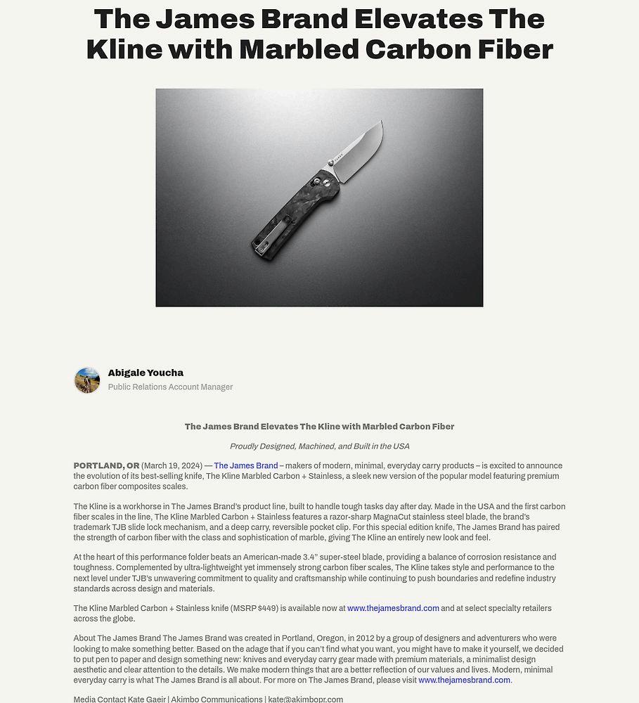 GearJunkie 1.75M Unique Visits Provided by March 21, 2024 • ONLINE Emerging Gear: The James Brand Marbled Carbon Kline gearjunkie.com/emerging-gear/emerging… The Kline Marbled Carbon + Stainless The James Brand Global Editorial Coverage 14