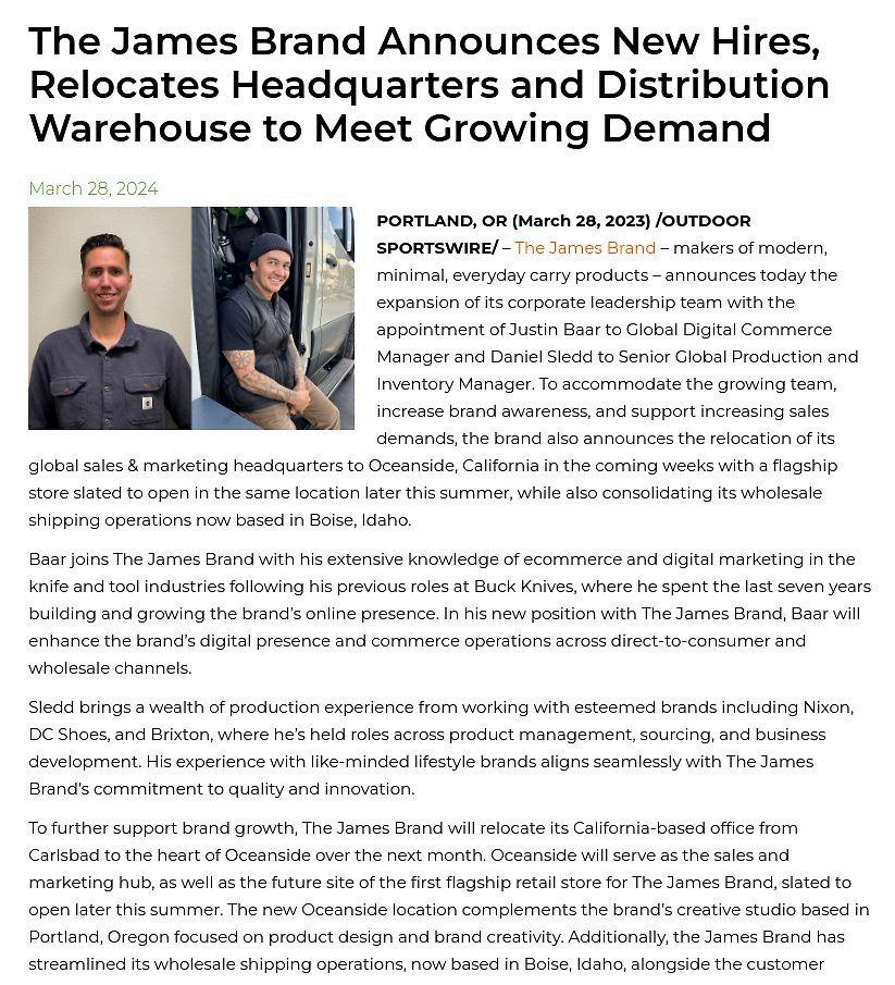 Outdoor Sportswire 6.76K Unique Visits Provided by March 28, 2024 • ONLINE The James Brand Announces New Hires outdoorsportswire.com/the-james-brand… The James Brand Announces New Hires The James Brand Global Editorial Coverage 57