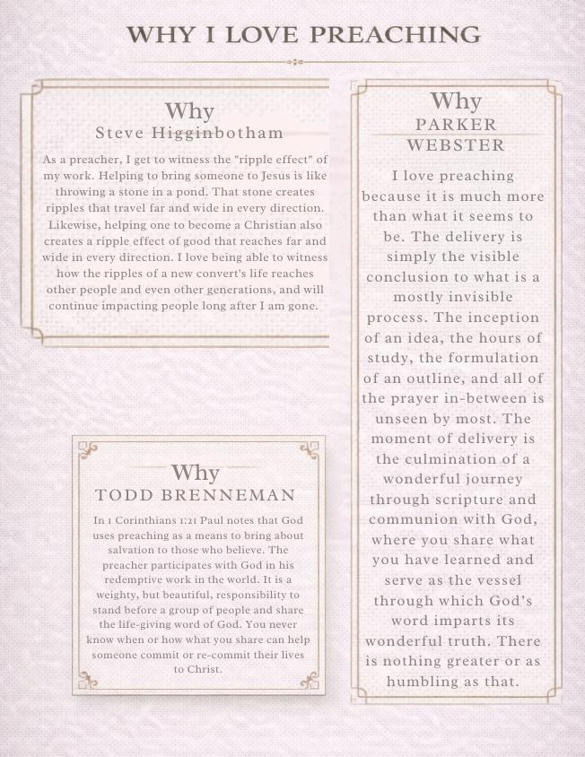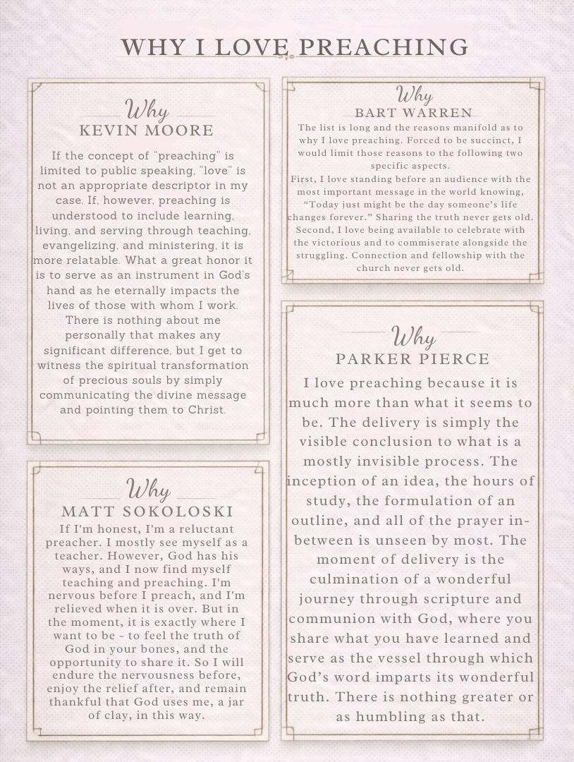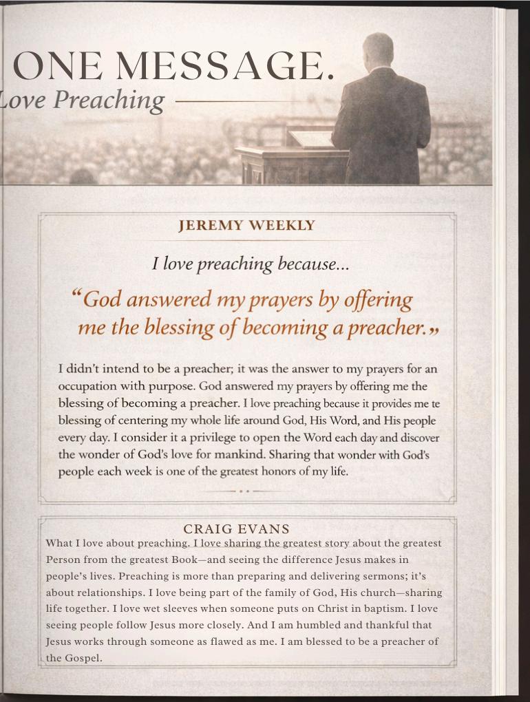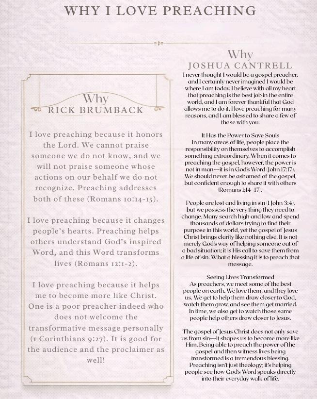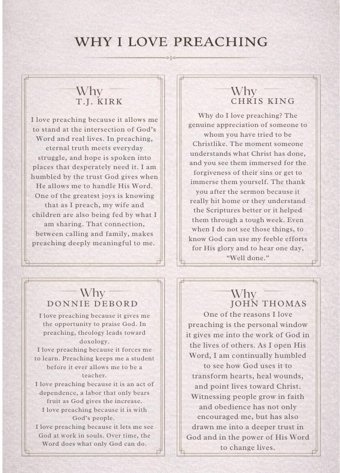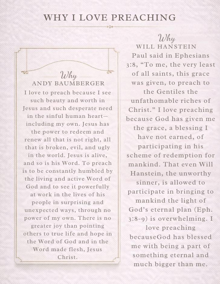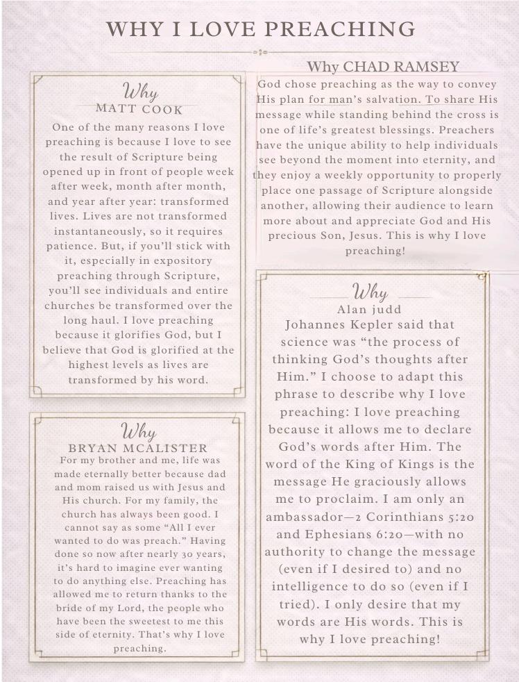 We hope you are blessed by this edition. In the middle of it all, we decided to do something pretty unique, we asked a number of the speakers (25 to be exact) to write a short piece on Why I love Preaching. This is rich, will delight your soul, and inspire you to renewal.