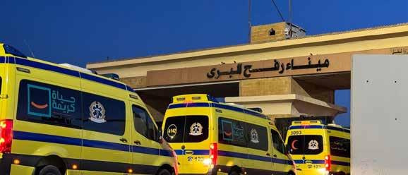 Ambulances wait in line at the Egyptian side of the Rafah border crossing