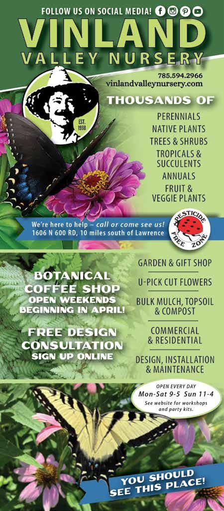 Sat, Apr 4, 1p; at Vinland Valley Nursery, 1606 N 600 Rd, Baldwin City, KS 66006. At this workshop, you will learn some tips and tricks for making any landscape look professionally designed and maintained – perfect timing for spring planting! Come with an idea of a new or existing area you would like to design and VVN staff will guide you through the process from start to finish. You will leave with new knowledge, a landscape template tool, and a garden design. $40 per person. 785-594-2966; vinlandvalleynursery.com