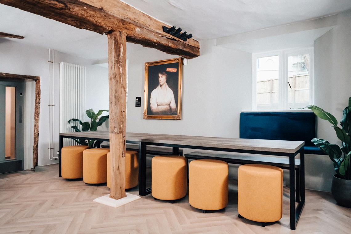 The ground floor features a spacious common room with flexible furniture arrangements, alongside a separate café area that provides an ideal setting for networking, refreshment breaks and informal meetings