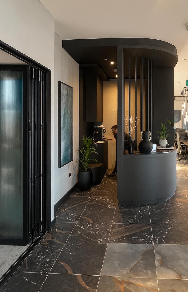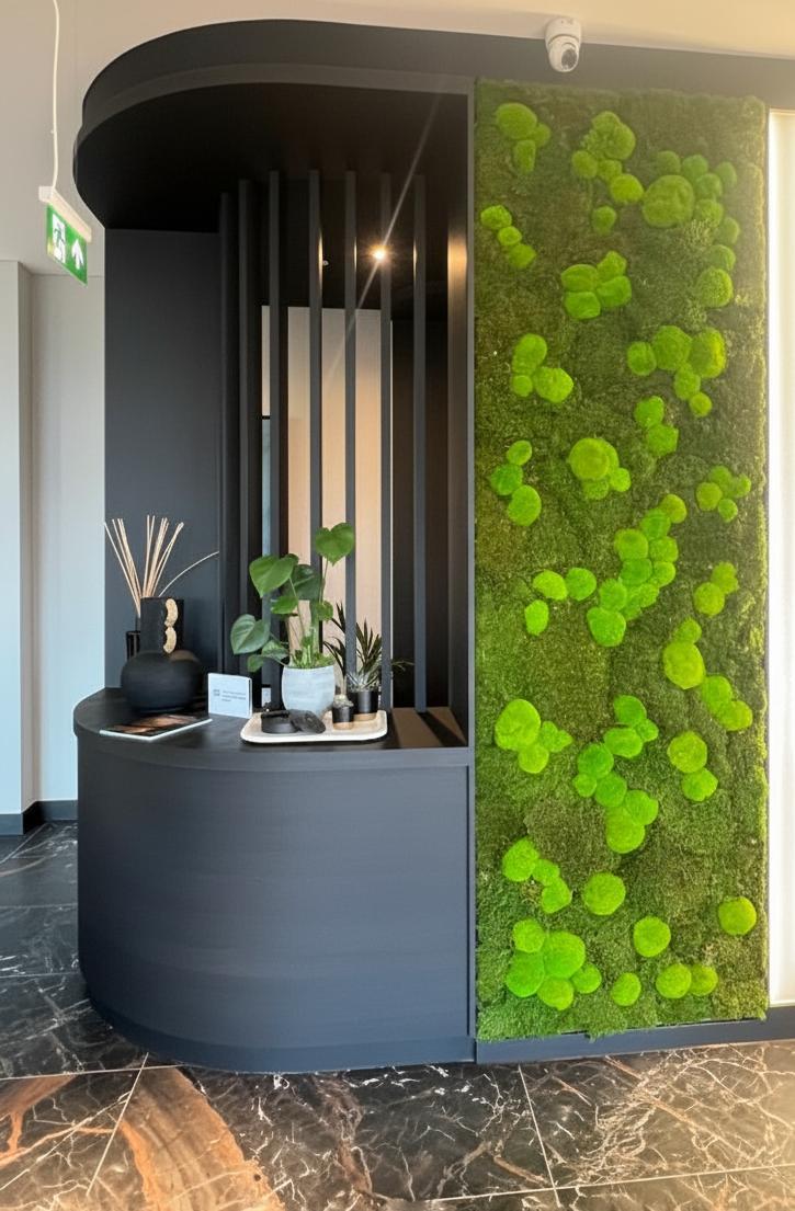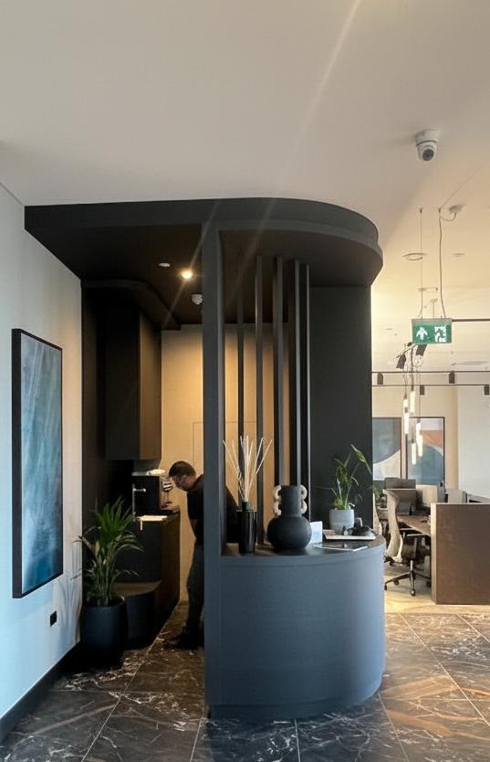 The project itself was a masterclass in precision. From a reception desk clad in Dekton porcelain with seamless mitres and a floating plinth, to a living moss wall and a high-level curved storage unit soaring over 3 metres, every detail had to feel effortless while hiding immense technical complexity.