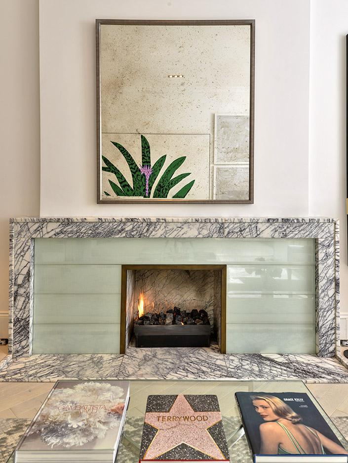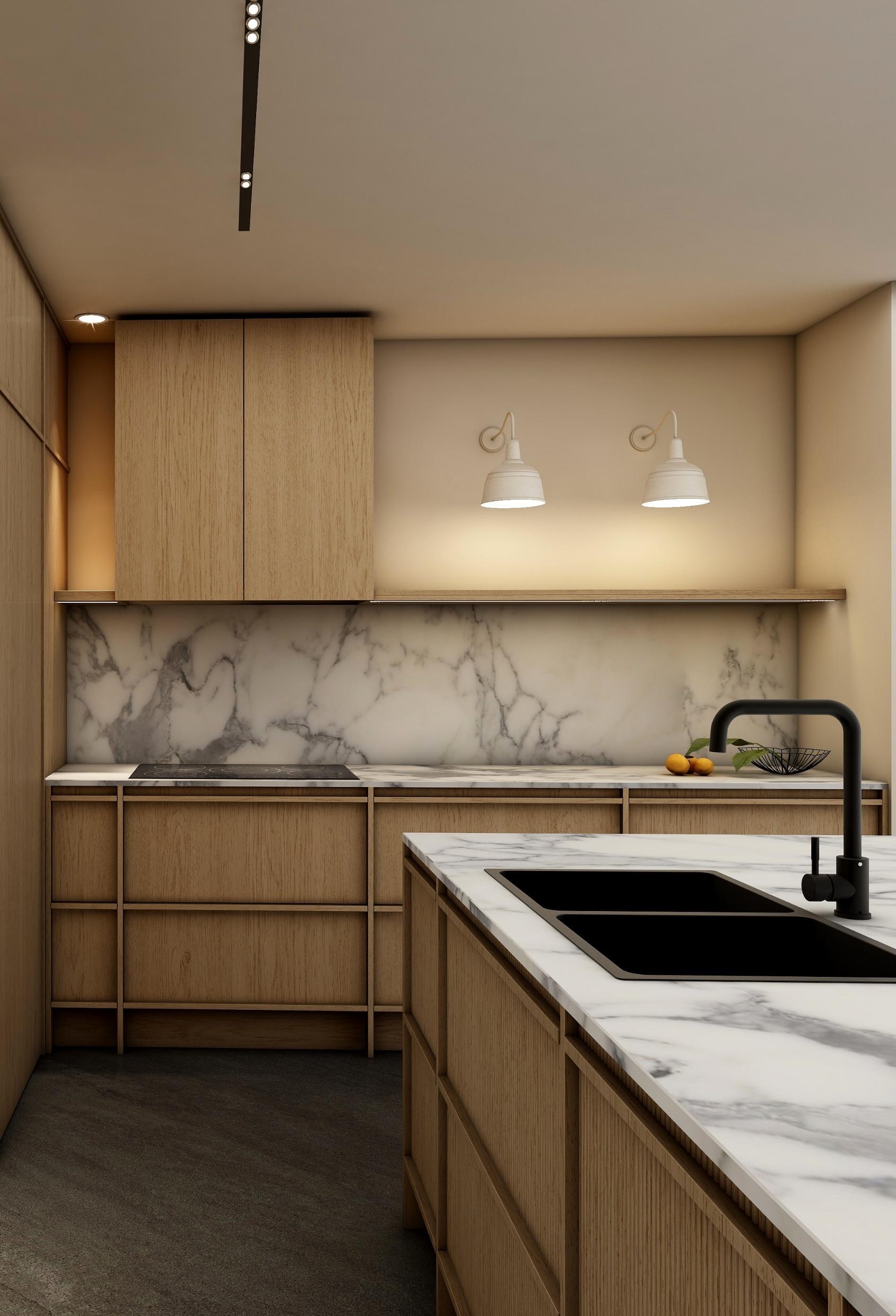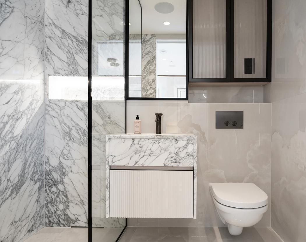 Fully clad with a palette of Arabescato marble, Pietra Grey fluted marble, and Dekton Helena.