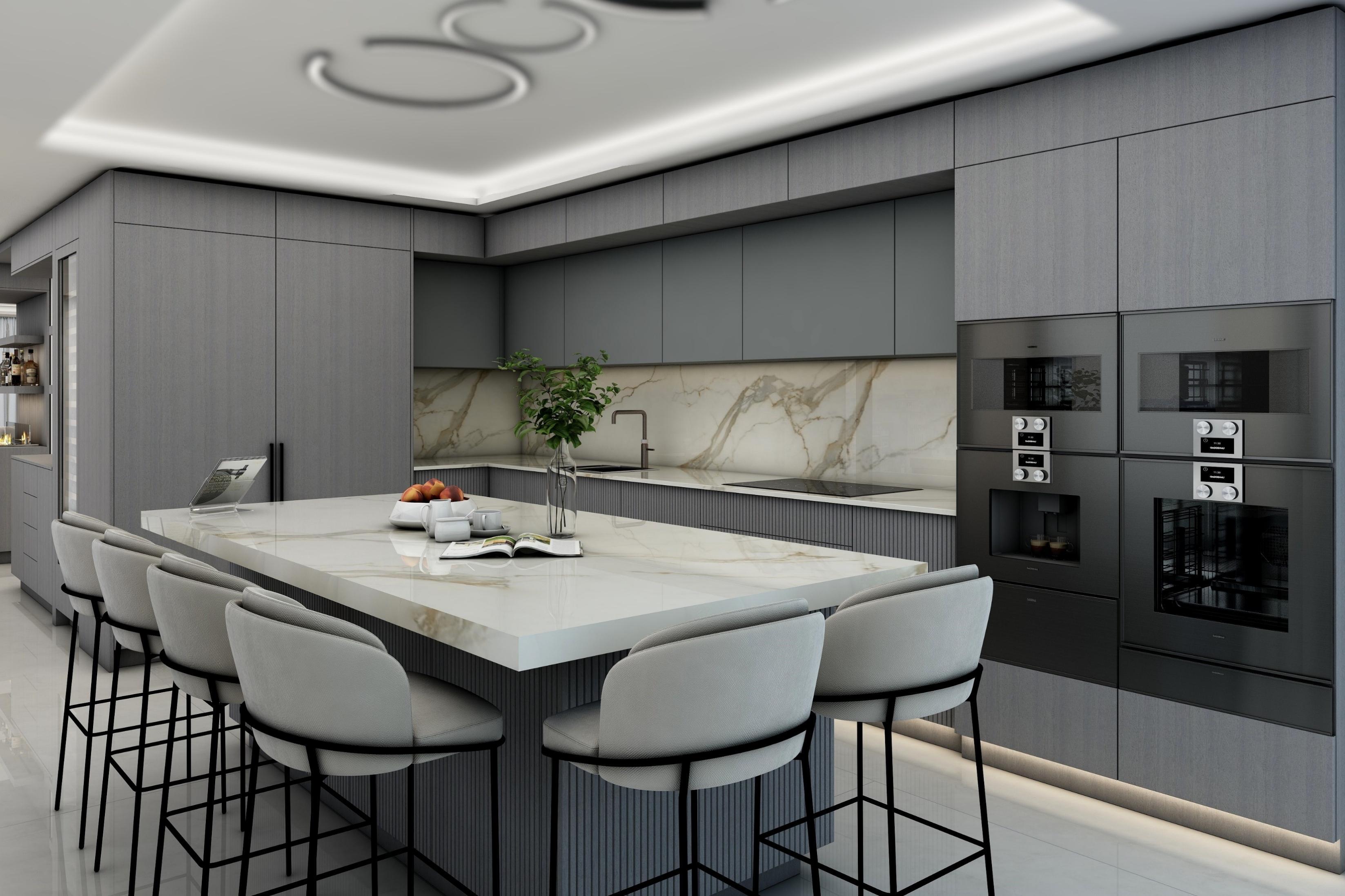 kitchen showcases a modern, minimalist style with matte grey and beige cabinetry paired with