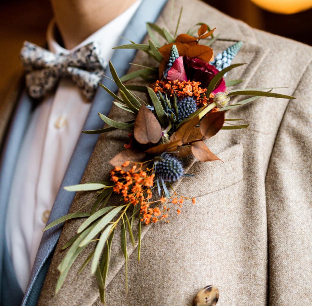 Las pajaritas y las corbatas en tejidos suaves y los boutonnières de tela en formato flor muy grande, son ya un must.