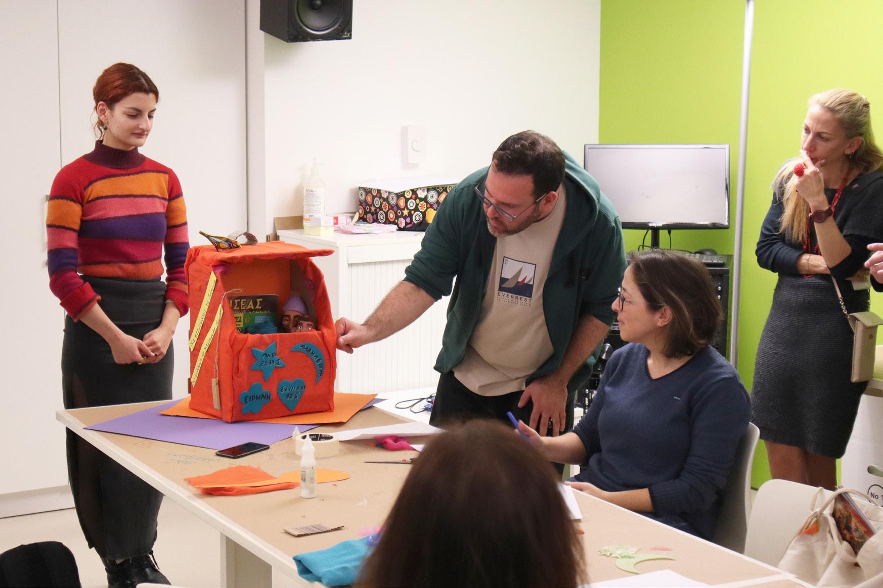 During the workshops that took place on 07/12/2023 and 11/01/2024, small groups consisting of members from ΕPAPSY, students from the 9th Painting Workshop of ASFA, postgraduate students from the Art and Psychotherapy Centre along with SKEP (Association of Social Responsibility for Children and Youth) President Ms. Athena Kritikou and its Communication Director Ms. Ileana Vasdeki, began to construct their own “luggage”, which conveys the feelings and thoughts of the heroes that they created in the first two meetings.