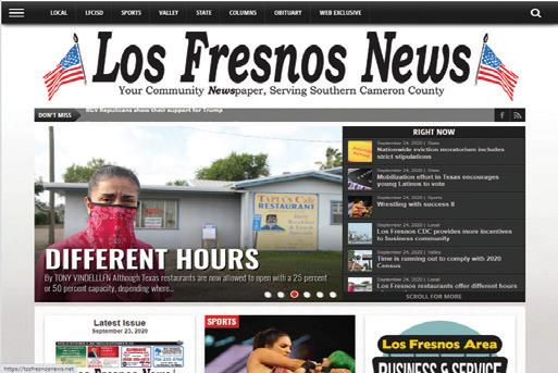 “Your Community Newspaper” 705 W. Highway 100, Suite B-2 Los Fresnos, TX E MAIL: info@losfresnosnews.net We are open Monday - Friday from 9:00 a.m. - 3:00 p.m. FOR IMMEDIATE ASSISTANCE: Call 956-264-7720 SUBSCRIPTION RATES $2795 Yr. Valley l $3495 Out of Valley Single Copy Price ........ $.50 ea. Back Issues available $.50 ea. CORRECTION POLICY Although the Los Fresnos News Staff strives for excellence in all stories and advertising, spelling or typographical errors can occur. If you find any confirmed factual or other type of error, please call 956-233-9928 during business hours or leave a message. WEEKLY COLUMNS printed in the Los Fresnos News contain the opinions of the Authors. They may or may not be the opinion of the Newspaper. HOW TO SUBSCRIBE: 1 year subscription delivered by U.S. Postal service...$27.95 or can be purchased at several convinent locations through out the cities of Los Fersnos and Brownsville for 50¢. The Los Fresnos News is mailed and delivered Tuesday, December 6, 2022, and published weekly by Los Fresnos Publishing, LLC. Periodical Postage Rates paid at Los Fresnos, TX. Post Office. Advertising deadline is noon Thursday at the office at 203 N. Arroyo, Los Fresnos, TX 78566.