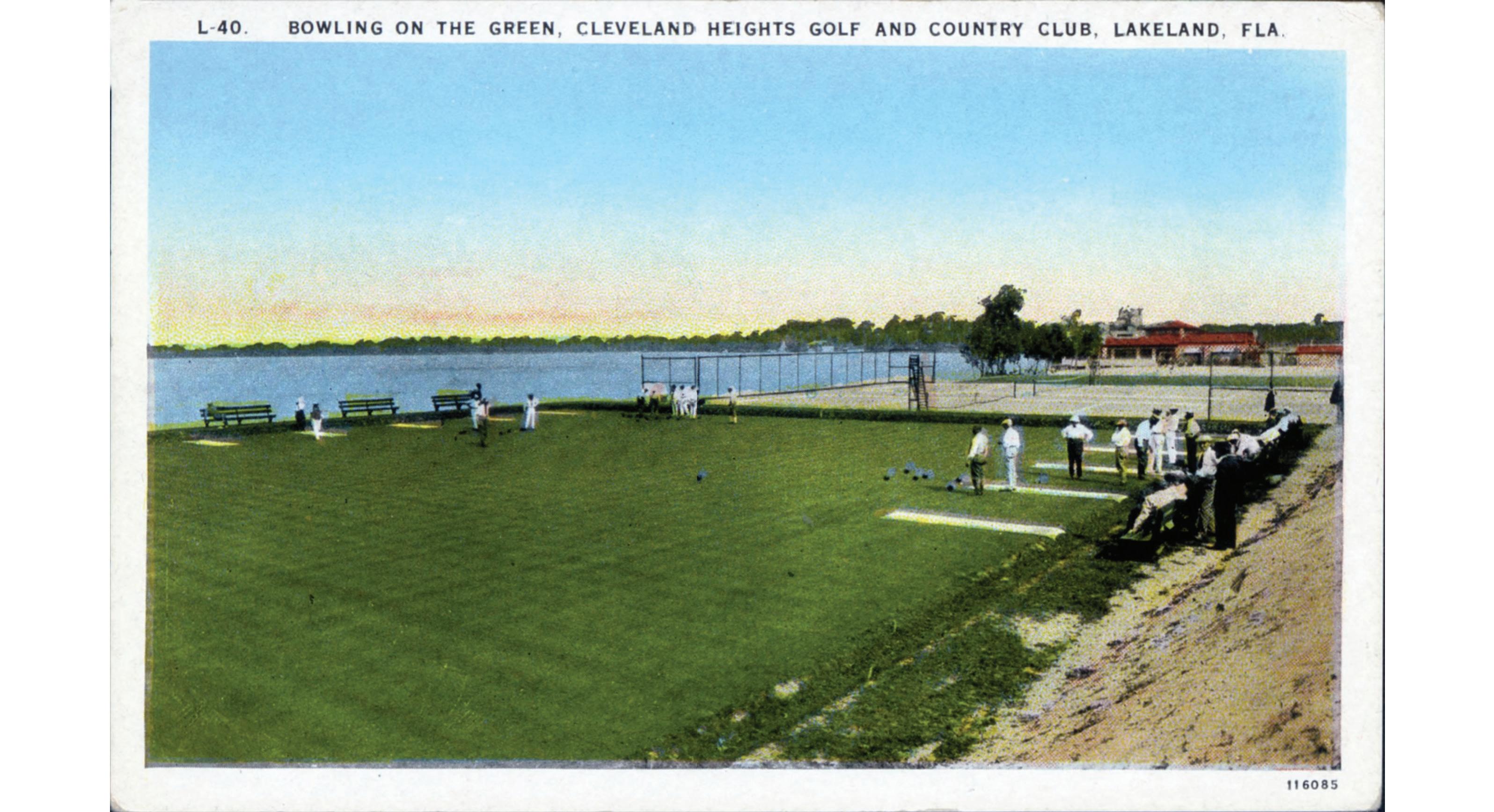 Members of the Cleveland Heights Golf and Country Club participate in lawn bowling on the club’s greens. Tennis courts and the clubhouse can be seen in the distance. The clubhouse, built in 1925 has been home to the Lakeland Yacht and Country Club since the late 1930s.