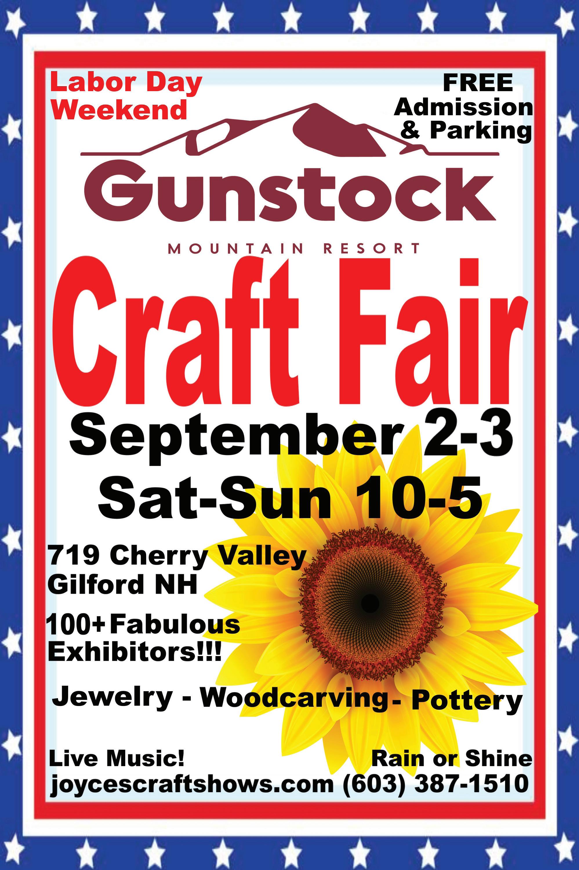 Come and celebrate the holiday weekend at the Labor Day Weekend Gunstock Craft Fair at Gunstock Mountain Resort, 719 Cherry Valley Rd., Gilford, NH, on September 2-3Saturday and Sunday 10 am to 5 pm both days. There will be over 100 fabulous arts & crafts exhibitors with a wide range of arts & crafts plus music on both days with North River. Some of the exhibits will include cedar wood furniture, leather jewelry & leather pocketbooks, wildlife photography, handsome soy candles, Lake Winnipesaukee aerial photography, handpainted metal/wood/slates/skis, resin art pictures, handcrafted wooden spoons,