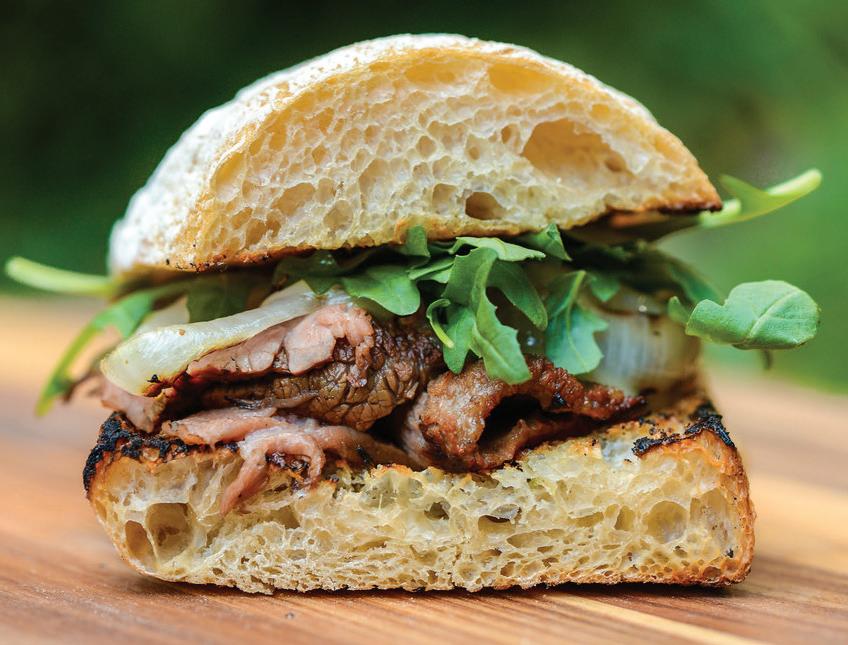 For the cotija mayo: whisk together all the ingredients in a small bowl. Set aside. For the marinade: place lime juice, olive oil, jalapeños, garlic, brown sugar, soy sauce, vinegar, salt, and pepper in the jar of a blender. Puree until smooth. Stab the steak repeatedly with a needler tenderizer (or do so with a fork on both sides of the beef). Place steak in a large resealable plastic bag. Pour in marinade and seal, removing as much air as possible. Massage the steak to get the marinade inside the beef through the holes you just gave it. Let marinate for 30-60 minutes while preparing the grill. Light the grill to high on one side and low on the other. Oil the grill, close the lid, and allow to preheat for 5 minutes. Remove the steak from the marinade. Place on the hot side of the grill. Cook until deeply browned on both sides (the thermometer should register 125 degrees when inserted into the center of the meat). Remove from grill. Set aside for 10-15 minutes. Slice into 2-inch portions with the grain, then slice against the grain into ¼- ½ inch strips. While steaks rest, brush onions with oil. Place on the hot side of the grill. Cook until charred on both sides and slightly softened, 4-5 • ‘Cue the Grill continued on page 6