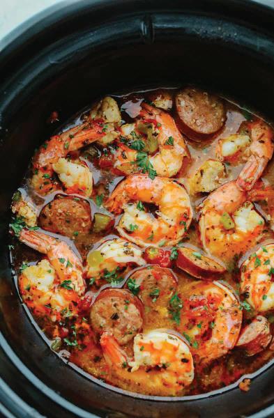 easily adjust to your own likings. This one, like the traditional, has andouille sausage, chicken, and shrimp, so you can adjust any of those or sub with something else if preferred. Again, we are using a slow cooker for this one. This recipe in a slow cooker just makes it grow in richness and flavor as time goes on, making this amazing. Some people prefer their jambalaya soupy, and others prefer it wet but not with a lot of broth. This recipe will give you options. It will feed 8, includes 20 minutes of prep time and slow cooks for 4 hours on high or 8 ½ hours on low. This has a tremendous blend of flavors.