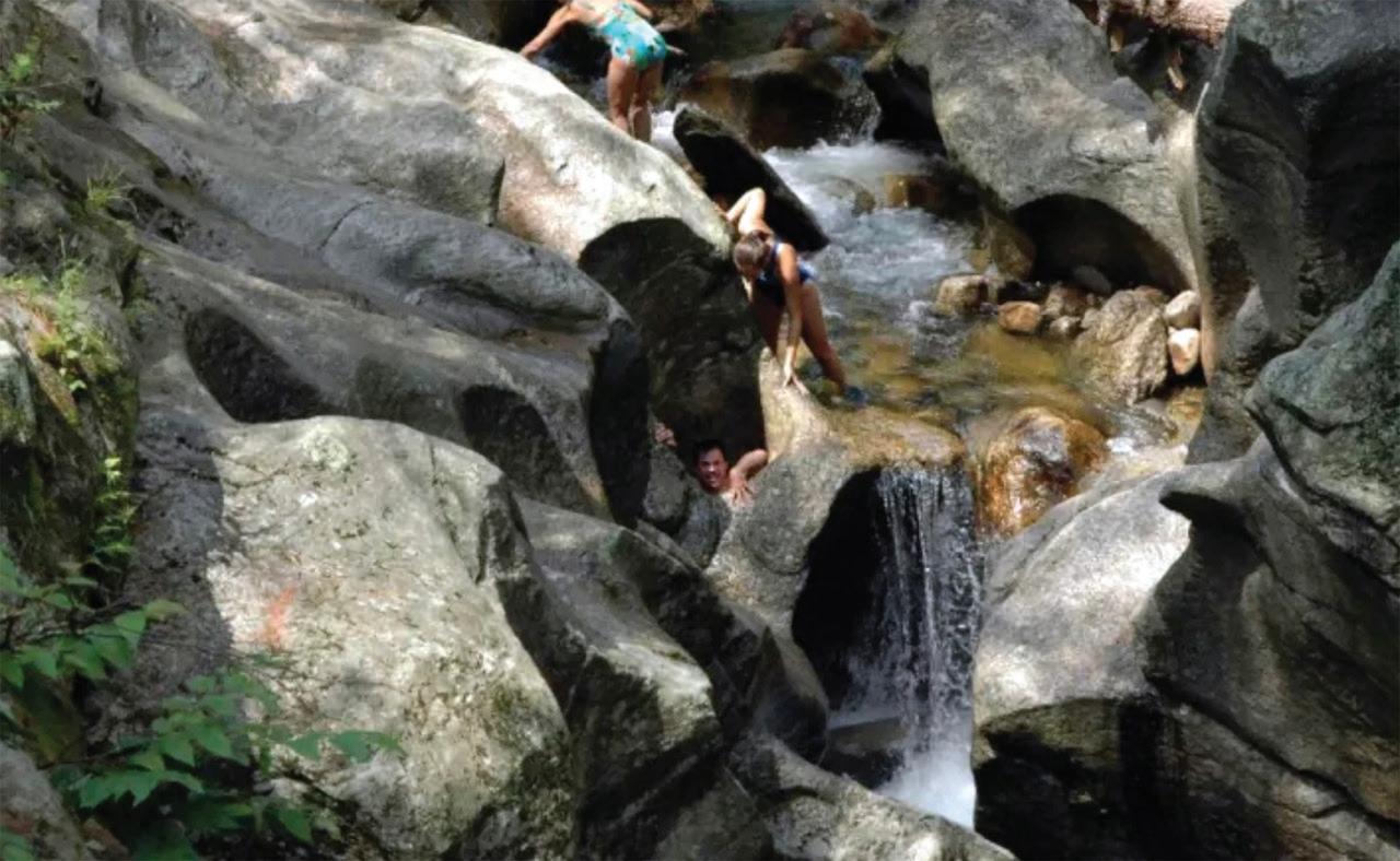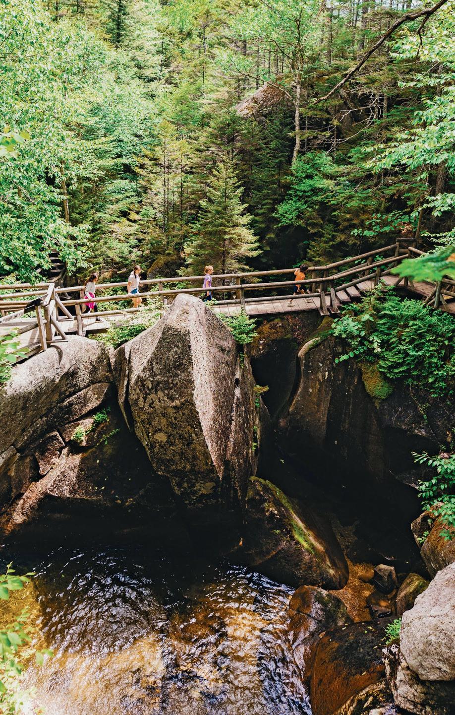A more challenging swimming hole — actually several holes scoured from rock through a 30-foot-high gorge created by the Cockermouth River in Groton — is known as Sculptured Rocks. There is a succession of kettle pools of varying depths, with narrow passages, small caves, and rock formations that call out for exploration. Besides jumping into the cool water, Sculptured