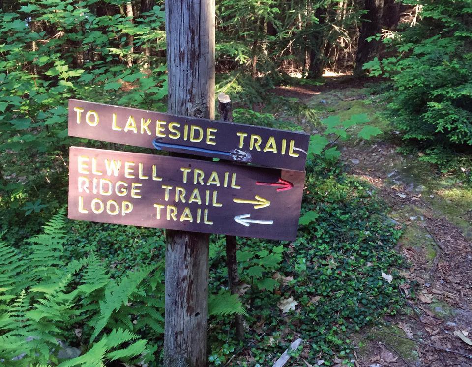 The trail, named after Colonel Alcott Elwell and Helen Chaffee Elwell, who donated the land to the New Hampshire Charitable Fund in the early 1960s, leads through some beautiful hemlock trees before descending into a deciduous forest of red maples and beeches.