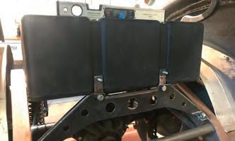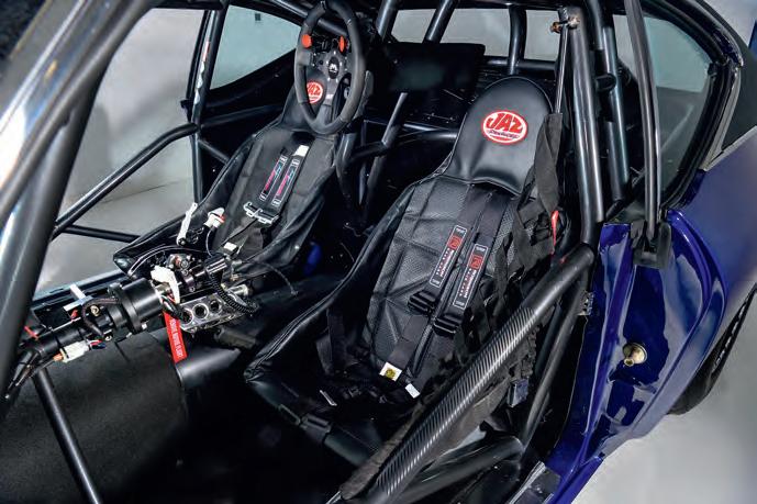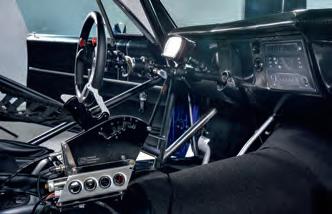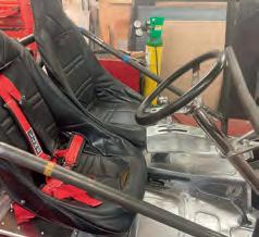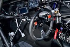 Geoff donned his face mask, slid between the snug rails, clicked the wheel into place and checked the controls. Below the Racepak screen, the steering wheel contains a push button that shifts from first to second. On the right are two green buttons to