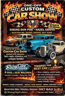 The One-Off Custom Show at The Rising Sun public house in Hazel Grove, Stockport SK7 6AD on Sunday 31 May kicks off at 12 noon. Hosted in conjunction with Rainy City Cruisers, there will be a trophy up for grabs for the Best Car of the Event. Paul and Julie Waldren, landlord and landlady, promise a great pub atmosphere and family-