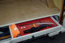 On the left of the cockpit is a manual lever for engaging neutral. Ahead of the neutral lever are the manual fuel shut off, the red ignition kill switch and above them two toggle switches that isolate the magnetos. To the right are four manually operated fire extinguishers buttons.