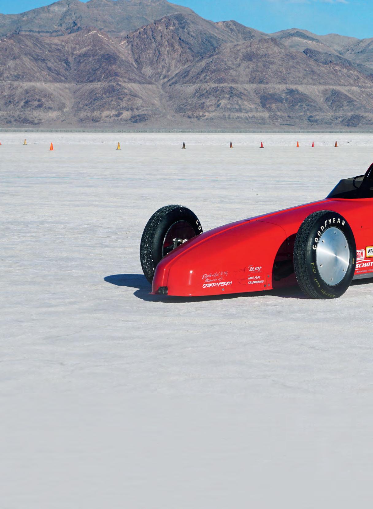 When he’s not racing at Bonneville, Geoff races twice a year on the hallowed dirt of El Mirage, a dry lake 100 miles north of Los Angeles where they have been setting records since the 1920s. There is no existing record in his class but the minimum to get the ‘Dirty 2 Club’ hat is 250mph. So far, Geoff has gone 240.448 in the dirt – where the