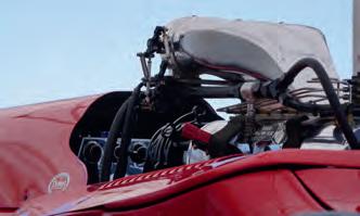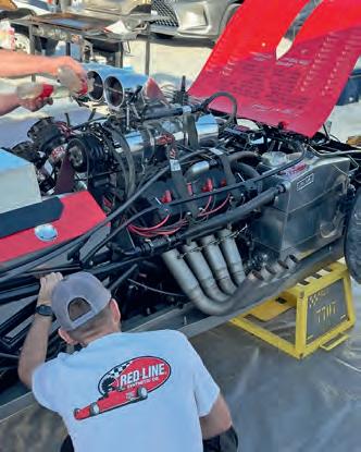 The procedure for starting a blown nitro motor is a process. First, because of some prevailing con rod issues, Scott Barnes, the ‘diver’ (he who dives under the car to service the bottom end), torqued the big end bolts before the eight gallons of Red Line 70cwt nitro oil were added. Meanwhile, the top-end crew of Nick Davies and Scott Campbell inserted the push rods and adjusted the valves. Forty-five gallons of fuel previously mixed by Nick were added by Rob Loaring while Pauly Rivera and Gabriel Rubio gave the car a visual check before Dzus buttoning up the body.