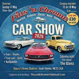 Gypsy’s Green Stadium in South Shields is the venue for the Fins ‘n’ Chrome Car Show on Sunday 17 May. Camping is available from Friday at the early bird price of £30 per pitch, and live music on Saturday night will be performed by The Glamz. The show offers cars and trucks, food vans, stalls and an autojumble.