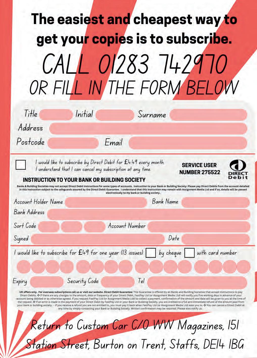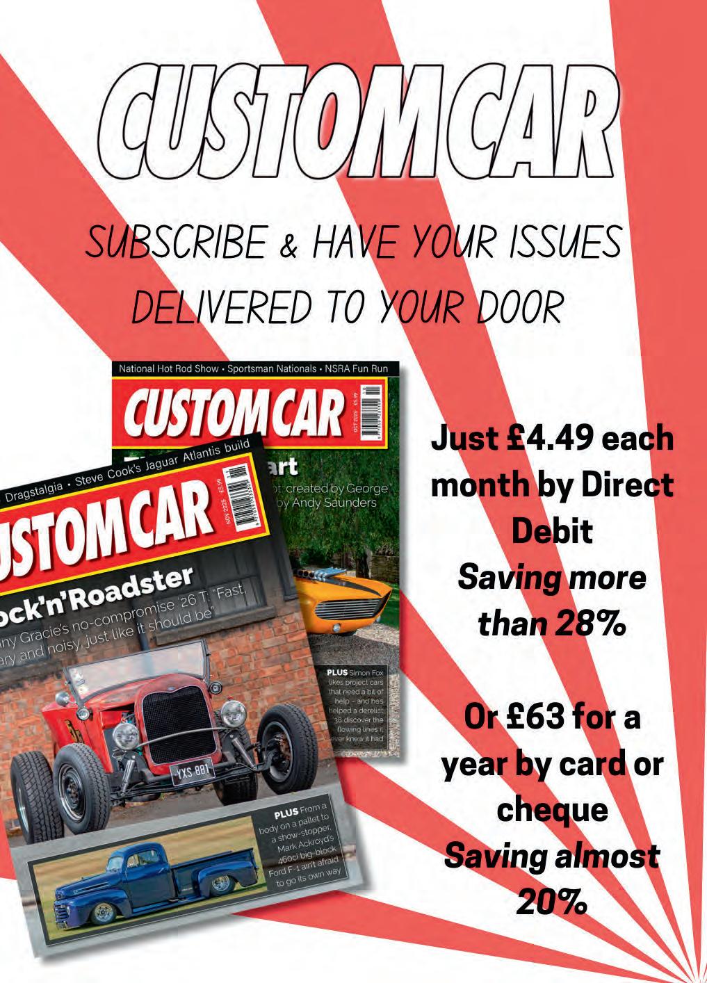 Every e ort is made to ensure the contents of Custom Car are accurate, but Piston Publications accepts no responsibility for errors or omissions nor the consequences of actions made as a result of these. When responding to any advert in Custom Car, you should make appropriate enquiries before sending money or entering into a contract. The publishers take reasonable care to ensure advertisers’ probity, but will not be liable for loss or damage incurred from responding to adverts