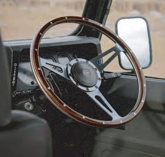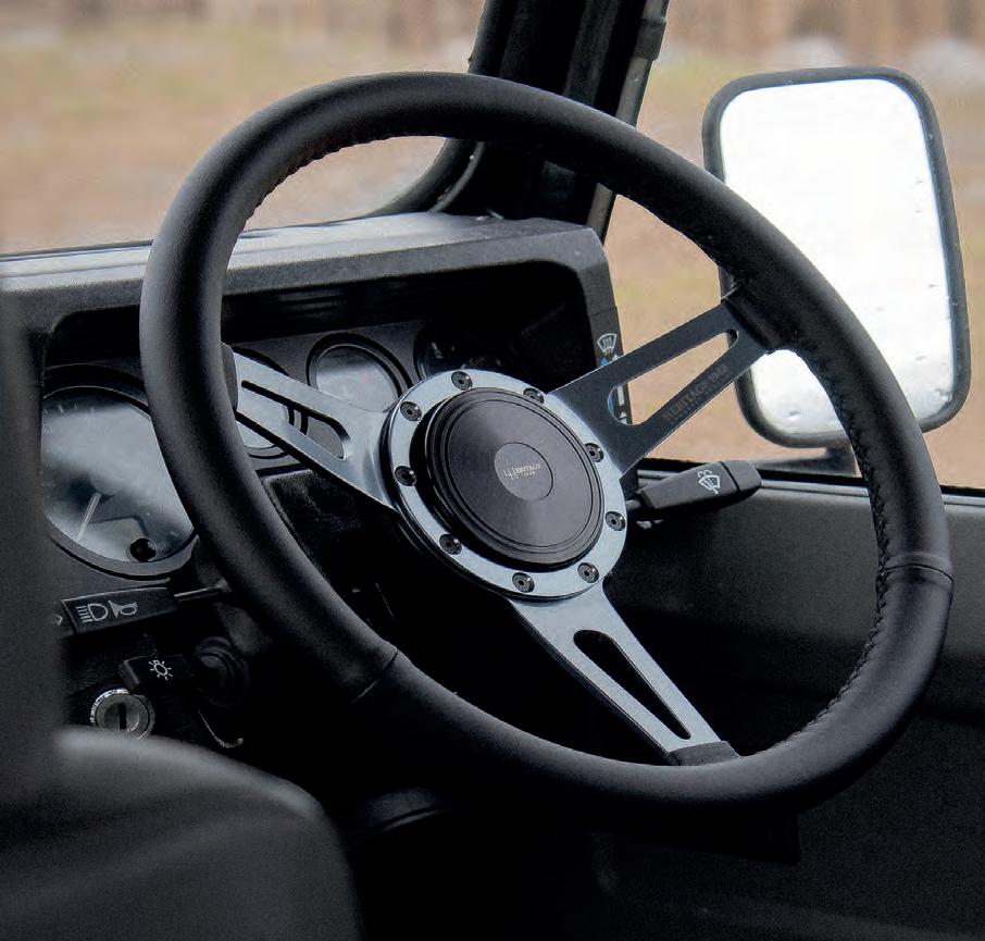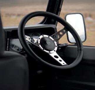 ensures a secure grip in any driving environment, whether your Landys on rugged trails or city streets. Meticulously designed and built with the craftsmanship synonymous with Heritage 1948. The gun metal grey is set o against a classic three-spoke design, enhanced by clean, crisp slots, adding a timeless touch to your Defender’s interior.