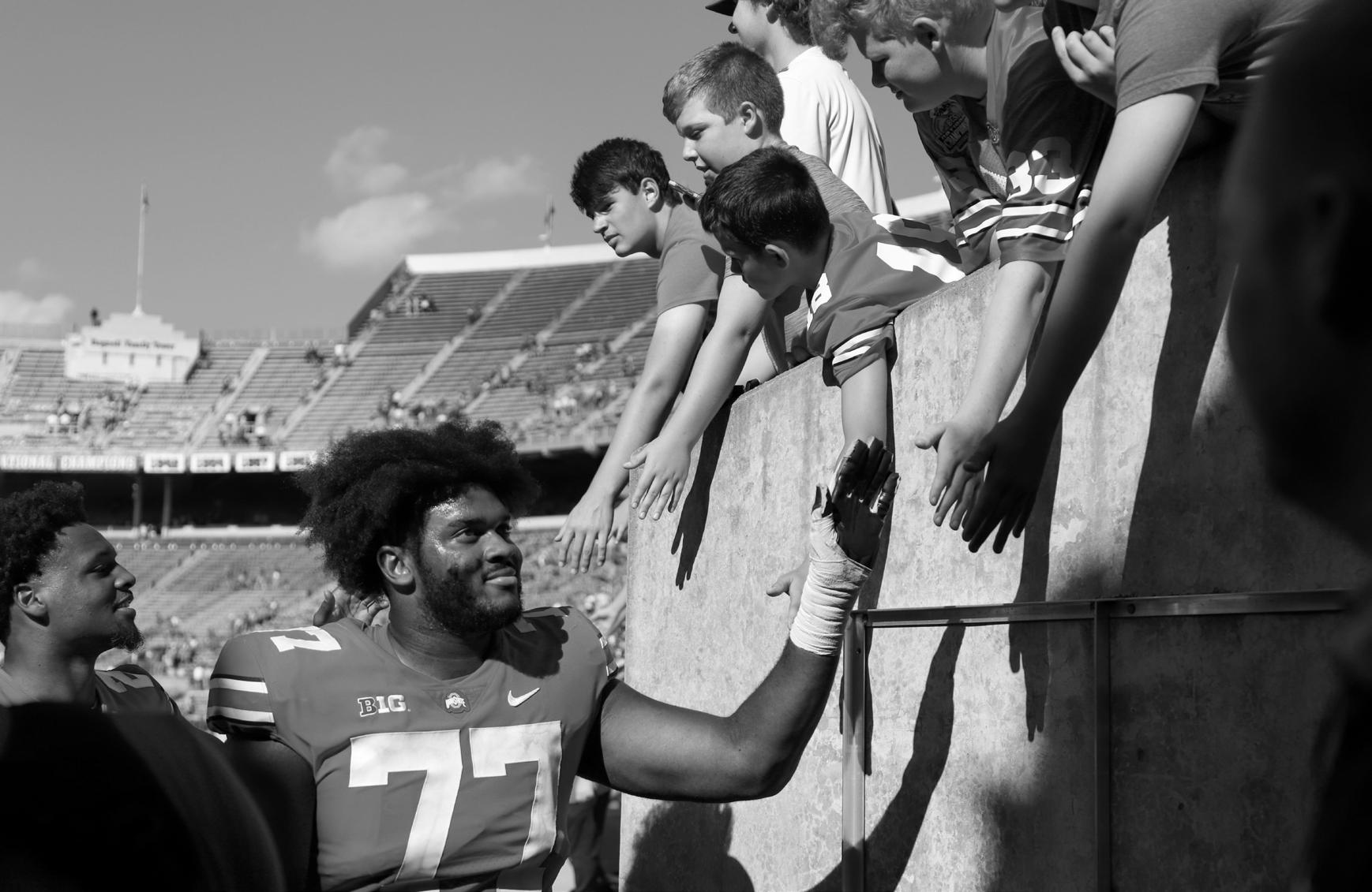 Ohio State then-sophomore offensive lineman Paris Johnson Jr. (77) gives fans high fives as he walks out of the stadium.