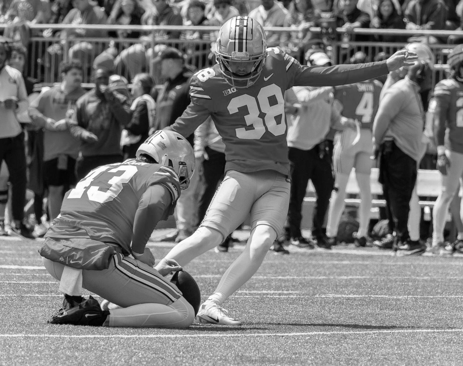 Long-snapper-turned-place-holder John Ferlmann (43) gets the ball down in time for kicker Jayden Fielding (38) to complete the extra point at last year’s spring game on April 12, 2025.