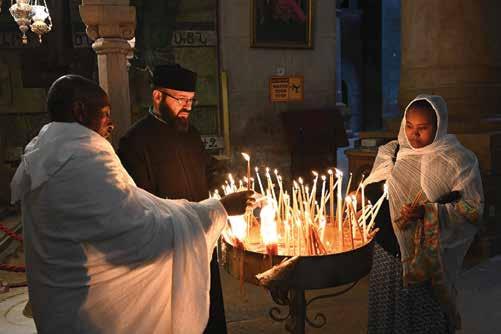 Fresh flowers arrive on Monday of Holy Week; green foliage is brought over from the main church. Arranging flowers and lights and fine-tuning the design occur through Wednesday. That night, there’s a final lighting check.
