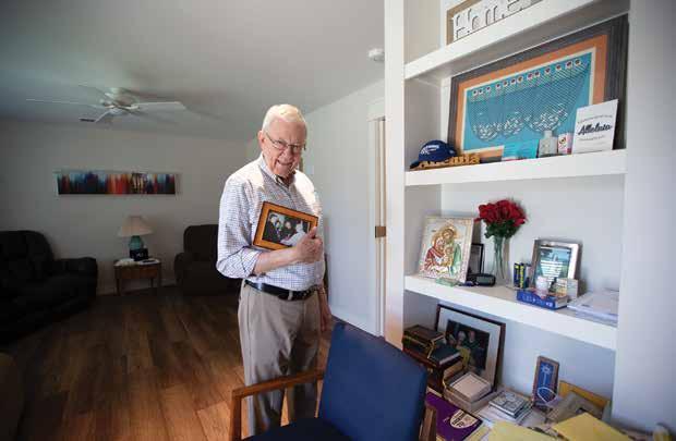 s Father Bob Hasenkamp has put the patio in his new digs to a different use, creating a garden where he grows flowers and several varieties of tomatoes that he shares with friends and his fellow residents. Of his new apartment and its amenities, he said, “Oh, it’s nice. I really like the space. The openness of it. Big walk-in closet. It’s very convenient; everything’s available.”