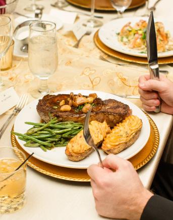 • Multiple choice entrée selections are priced per menu item with chef’s choice of accompaniments. A choice of no more than three (3) entrées may be given to guests prior to the event. Final entrée counts, as well as a list of guest names and their entrée selection, are required with your final guarantee by 11 a.m., fourteen (14) business days prior to the event.