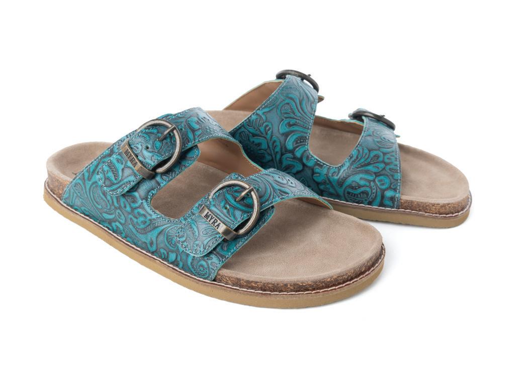 Bluebell Ranch Handtooled Leather Sandals in Alpine Teal