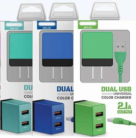 10W Dual USB-A Port Mini Travel Charger Assortment 16 Piece Display Program Fast Charging Adapter 4 Colors (Pink, Green, White, Blue) 4 pieces each color Counter-top Display Case