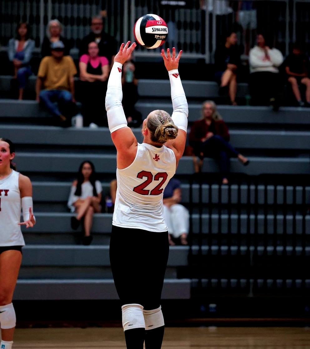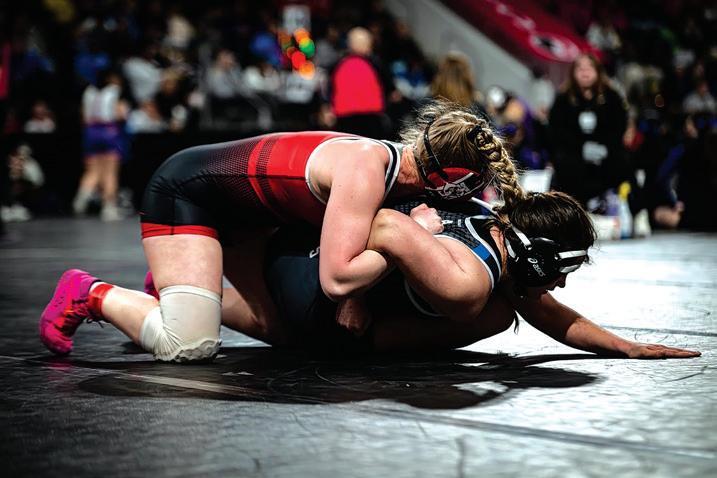 TOP: Molly Carlson ‘26 goes for a dig in a volleyball game. Carlson is a three sport athlete and has played varsity in the majority of her time. BOTTOM: Molly Carlson ‘26 takes down her opponent in a wrestling match at the Donny Brook Tournament at Xtreme Arena. PHOTOS BY AMBER SEATON & ROSE NKUMO