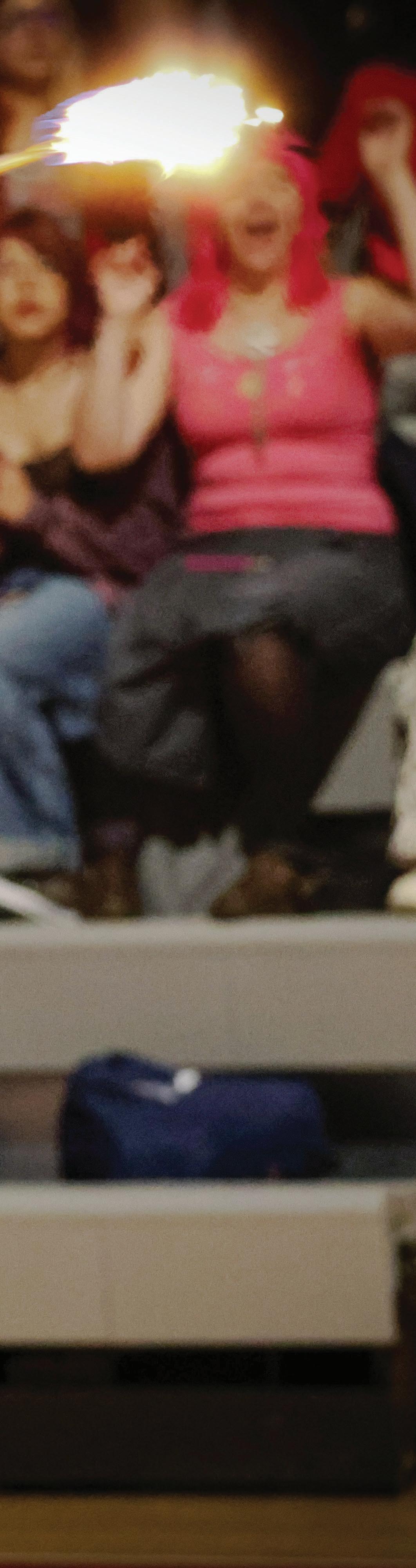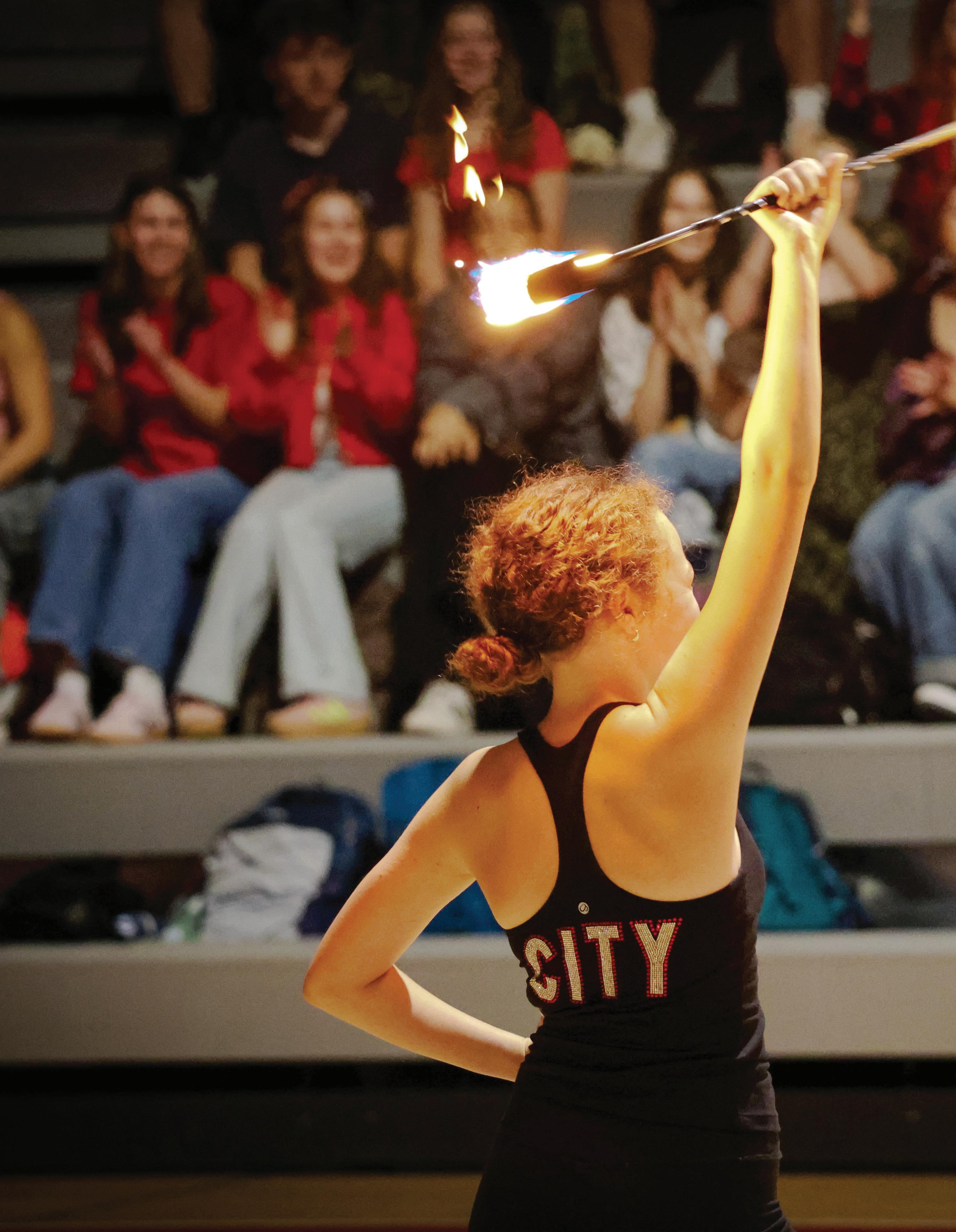 FEATURED PHOTO: Alaina Baxter ‘29 ignites the crowd with her impressive re baton twirling performance during the Homecoming pep rally. PHOTO BY STELLA