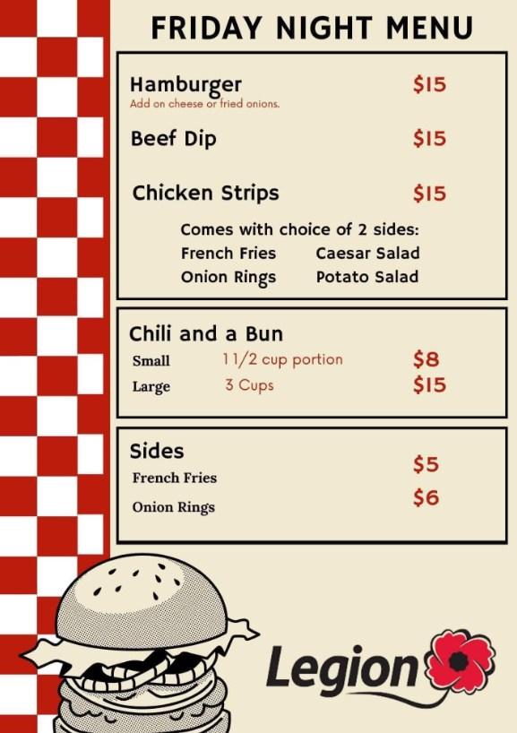Come join us February 14 for the Legion Sweetheart Day! “Because the Legion Loves You” Sweetheart Basket: 1lb of wings, plus, a beverage: $14 This selection includes 1lb of wings, (15 different flavours to choose from. Plus, 1oz cocktail, or, 1 glass (8oz) wine, or, 1 domestic beer (341 to 355ml), or 1 cooler, (341 – 355ml)