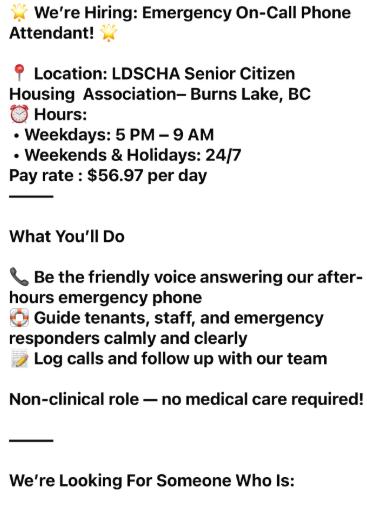 The Burns Lake Legion is looking for volunteer help on Fridays from 5 PM - 8 PM…..also on Saturday evenings! We are in search of servers for our dinner hours; this includes serving dinners, removing plates, wiping down tables, possibly preparing salads if need be, and wrapping cutlery if needed….NO DISH WASHING!!! If you are interested please call Carol Blackwell @ -692-0744 ….. any help is much appreciated!