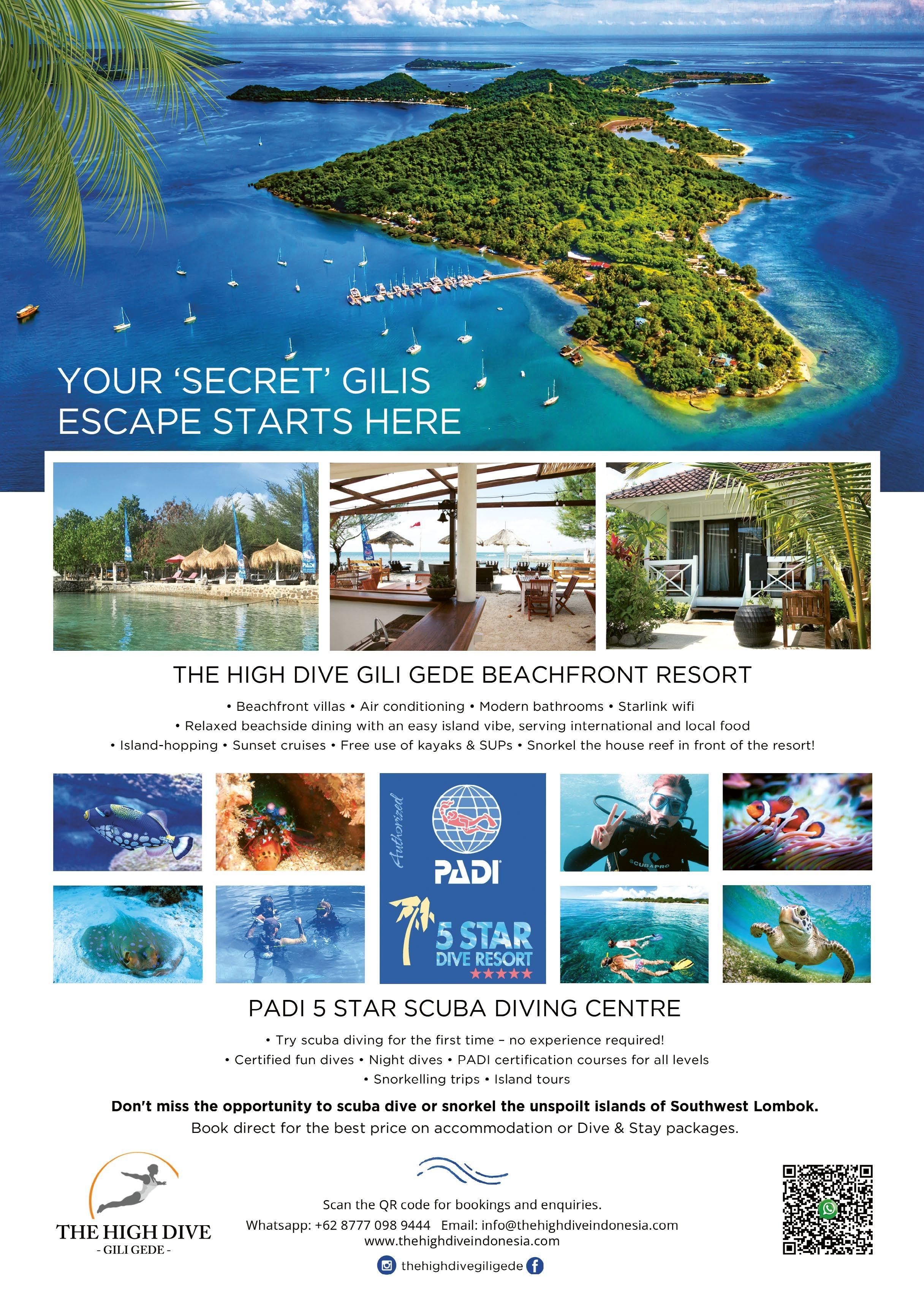 The High Dive Resort, Gili Gede is the only PADI 5-star certified dive resort in Southwest Lombok and is the perfect choice for those wishing to learn to dive in a small, personalised setting with highly experienced dive masters and instructors. Whether you are learning to dive, upgrading skills, or just wish to explore an area with pristine reefs, a vast variety of underwater life, and uncrowded diving locations – the High Dive Resort is for you.