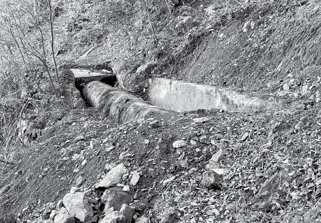 Il canale di adduzione (Foto 2), lungo 2.820 metri, costeggia le pendici del monte tenchia per raggiungere la vasca di carico posta a monte della centrale di Enfretors a quota 800 m s.l.m.