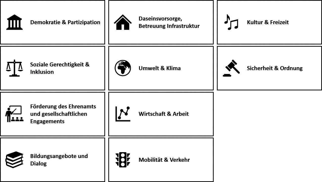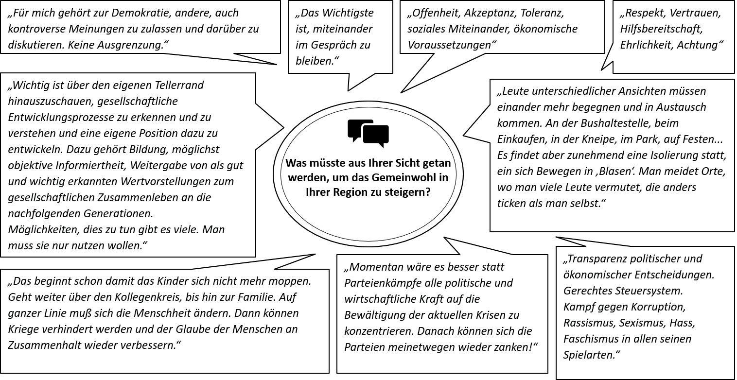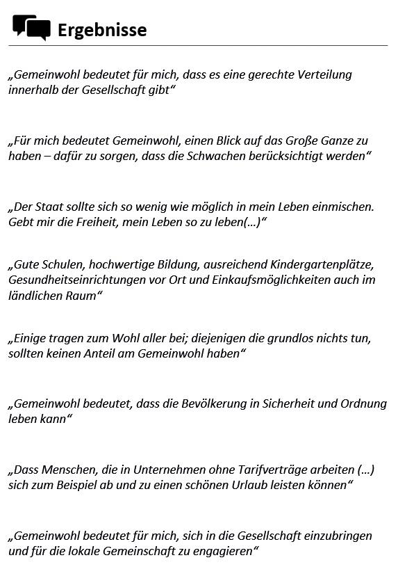 lungen zwischen Stadt- und Landbewohner:innen statistisch geprüft. Die Ergebnisse wirken zunächst etwas enttäuschend: Es konnten keine signifikanten Unterschiede in der Gemeinwohlorientierung – weder quantitativ, noch qualitativ – gefunden werden. Mögliche Gründe dafür sehen die Autor:innen in der gemeinsamen Geschichte, die eine kollektive Identität erzeugt bzw. verstärkt haben könnte, welche wiederum in gemeinsamen Erfahrungen (wirtschaftlichen Schwierigkeiten der Übergangszeit, Herausforderungen der Anpassung an eine neue politische und soziale Ordnung) verwurzelt sein könnten. Letztlich identifizieren die Autor:innen zehn Handlungsfelder zur Stärkung des Gemeinwohls, die nicht auf regionale Spezifika beschränkt sind und daher für alle öffentlich-rechtlichen Sendeanstalten und für sie arbeitenden Journalist:innen von Relevanz sein können: (1) Demokratie und Partizipation, (2) soziale Gerechtigkeit und Inklusion, (3) Förderung des Ehrenamts und des gesellschaftlichen Engagements, (4) Bildungsangebote und Dialog, (5) Daseinsvorsorge, Betreuung und Infrastruktur, (6) Umwelt und Klima, (7) Wirtschaft und Arbeit, (8) Mobilität und Verkehr, (9) Kultur und Freizeit sowie (10) Sicherheit und Ordnung.