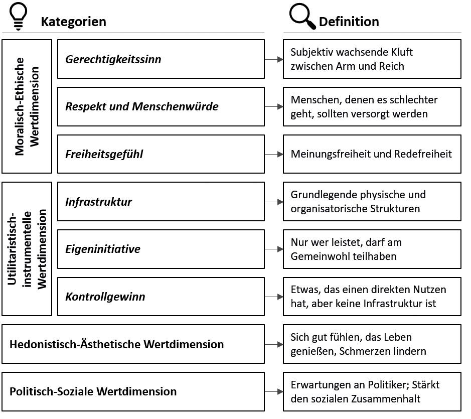 Die Entwicklung von programmlich relevanten Maßnahmen zur Überwindung der wachsenden Kluft zwischen städtischen und ländlichen Gebieten ist auch das Ziel des Beitrags von Johannes Sonntag, Clemens Söhngen (beide: HHL Leipzig Graduate School of Management) und Gerlinde Frey-Vor (Mitteldeutscher Rundfunk). Die Autor:innen stellen Ergebnisse aus einer umfassenden qualitativen Befragung vor, in der das Verständnis von Gemeinwohl (gemäß der bedürfnisorientierten Public Value-Theorie Timo Meynhardts) bei Stadt- und Landbewohner:innen in Mitteldeutschland erhoben wurde. Mitteldeutschland erachten die Autor:innen dafür als eine besonders geeignete Region, da sich die Unterschiede zwischen städtischen und ländlichen Gebieten mit den sozialen und wirtschaftlichen Unterschieden zwischen Ost und West überlagern. Die zunächst induktiv kategorisierten Antworten der Befragten wurden deduktiv den vier von Meynhardt definierten Wertdimensionen (moralisch-ethisch, hedonistisch-ästhetisch, utilitaristisch-instrumentell und politisch-sozial) zugeordnet und die ermittelten Vertei-