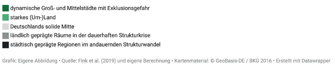 Mit der viel diskutierten Spaltung zwischen Zentrum und Peripherie befasst sich Olaf Jandura (Hochschule Düsseldorf) unter besonderer Berücksichtigung der Rolle der Medien im ländlichen Raum. Zunächst werden unterschiedliche „Raumtypen“ in Anlehnung an den Sozioökonomischen Disparitätenbericht der Friedrich Ebert-Stiftung unterschieden, womit nicht auf traditionelle Dichotomien wie „Stadt und Land“ oder „Ost und West“ zurückgegriffen und insofern ein neuer Maßstab gesetzt wird, als die gewählten Raumtypen eine wesentlich differenziertere Betrachtung ermöglichen. Raumtyp 1 beschreibt „dynamische Städte mit erhöhter Exklusionsgefahr“, Raumtyp 2 das „wohlhabende Umland“, Raumtyp 3 „Deutschlands solide Mitte“, Raumtyp 4 „strukturschwache Räume mit Aufholerfolgen“ und Raumtyp 5 „altindustriell geprägtes Städte mit strukturellen Herausforderungen“. Raumtyp