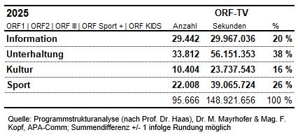 Das Ergebnis zeigt für 2025 die Anteile am TV-Gesamtprogramm von ORF1, ORF 2, ORF III, ORF SPORT + und – dem neu hinzugekommenen – ORF KIDS in einem angemessenen Verhältnis zueinander: 20% Information, 38% Unterhaltung, 16% Kultur und 26% Sport.