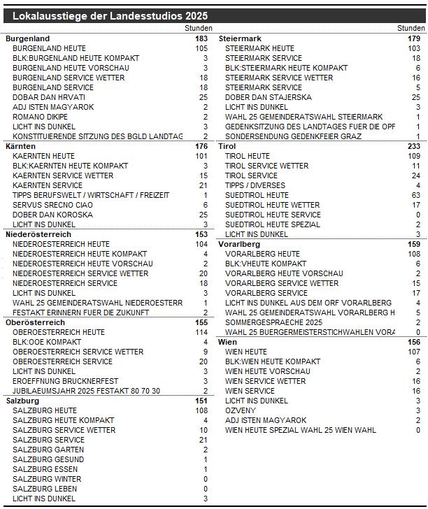 Das gesendete Programm der ORF-Radios kann aus Kapazitätsgründen nicht vollständig EDV-technisch erfasst werden. Da das Radioprogrammschema erfahrungsgemäß über das Jahr hinweg nur geringen Schwankungen unterliegt, wurde – nach gewohntem Muster der Vorjahre – auch 2025 wieder eine „typische“ Woche ausgewählt und der Programmoutput aller ORF-Sender einer detaillierten Inhaltsanalyse unterzogen. Als Musterwoche 2025 wurde die Woche vom 8. bis 14. September bestimmt. Gemäß internationalen Erfahrungen in der Radioforschung kann die Analyse solch einer „typischen Woche“ dazu dienen, eine Orientierung für die Programmstruktur der jeweiligen Sender zu geben. Bis 2017 wurde die Datensammlung von den Sendern selbst (Ö1, Hitradio Ö3, FM4) oder von der ORFMedienforschung (für die ORF-Regionalradios) organisiert und ausgeführt. Seit 2018 werden Analyse und Auswertung von der APA-Comm durchgeführt, wobei das Analyseschema unverändert blieb, d. h. die zur Klassifizierung herangezogenen Hauptkategorien sind über die Jahre konstant.