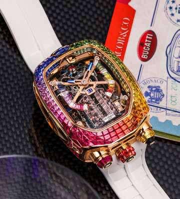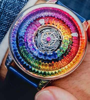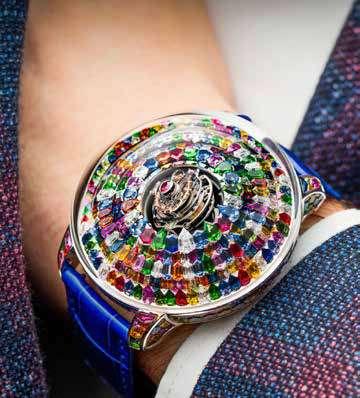 And the Rainbow setting, which has proven fantastically sought-after in gem-set watches, has become a specialty of Jacob & Co. All three demand the procurement of perfectly matching sets of colorful precious gemstones, offering a precisely mastered tone progression, a sure sign of extremely fine expertise.