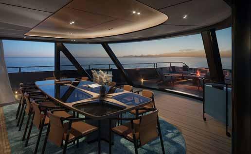 The forward section of Grande 44M’s Upper Deck can be fitted out as a media room for guests or reserved for the owner, or alternatively as a dining area with veranda accommodating 12 people. In both cases, almost two-meter-long windows on either side provide open views outside, where a lounge area in the bow with a small firepit offers a cozy space from which to watch the sun set over the water. It’s a lifestyle aspired to by everyone who loves the sea.