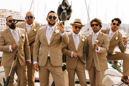Sean’s suit was originally intended to be dark green, but no Maltese supplierscould fit all the groom’s team and family members with green suits, so the groom’s colour scheme changed to beige suits. Sean’s had an ivory cravat and waistcoat. And he woreVictor Azzopardi Jewellers’ green and gold cufflinks to match his prized 2005 Rolex Datejust which he had just purchased as a memento, after performing with his band The Busker in the semi-final of the Eurovision Song Contest in Liverpool,in 2023.