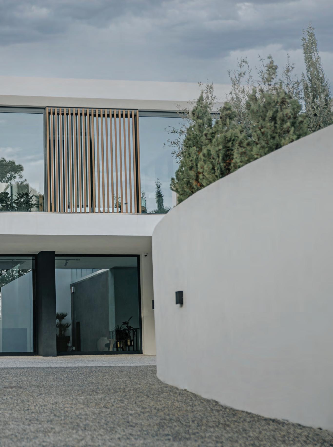It’s a newly built house in a villa area, which involved excavation, construction, and finishing, but you wouldn’t notice it right away. A particular feature of this house is that it is set back from the surrounding streets, screened by abundant vegetation and surrounded by vernacular boundary walls. The contemporary building gradually comes into view as one approaches it along the private driveway.
