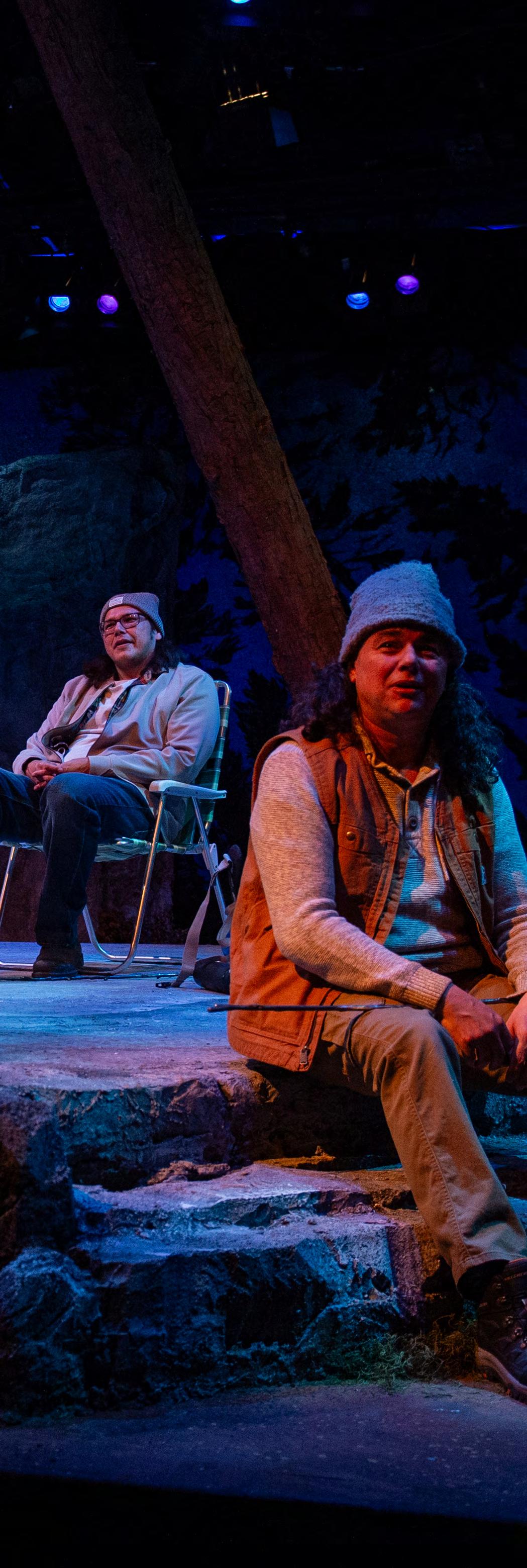 trols the actors’ shadows to give them dynamic movements, which also heighten the production’s eerie feeling. In the final portion of the play, the unnamed creature takes George, and he returns to the campsite with a much more blissful and passive attitude than his previously established demeanor. Smith demonstrates his wide range of acting capabilities by essentially playing two different characters and fitting both roles perfectly. The uncanny 180-degree turn he performs makes the whole production. Moreover, there are similarities between the changes to George’s behaviour and reallife personality shifts caused by drug addiction, so the story is particularly impactful for audience members who have personally witnessed substance abuse.